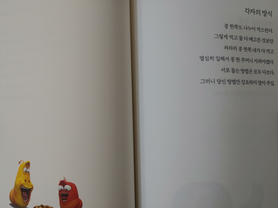 이 책을 보면서 인생에대해 많은 걸 배우고 있다. 간결하면서도 내용 전달이 팍 되는 공감되는 이야기들이 많다. 방금도 유튜브를 틀어서 라바 검색하면서 동영상을 보고 오는 길이다. 힘든 길거리 생활 속에서도 서로 다른 레드와 옐로는 성격도 달라 티격태격하며 다툼을 일삼지만 정말로 서로가 필요하고 도움이 필요할 때 서로에게 도움이 돼주기도 한다. 그리고 코믹한 부분도 빼먹지 않는 애벌레들.